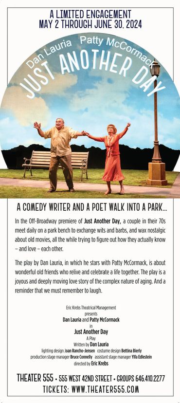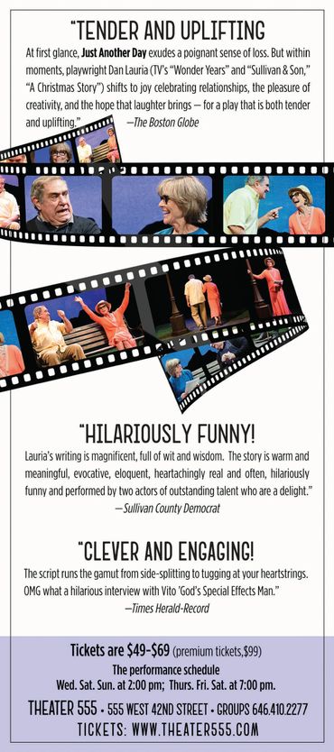 At first glance, “Just Another Day” exudes a poignant sense of loss. But within moments, playwright Dan Lauria (TV’s “Wonder Years” and “Sullivan & Son,” onstage in Boston in “A Christmas Story”) shifts to joy — celebrating relationships, the pleasure of creativity, and the hope that laughter brings — for a play that is both tender and uplifting.
